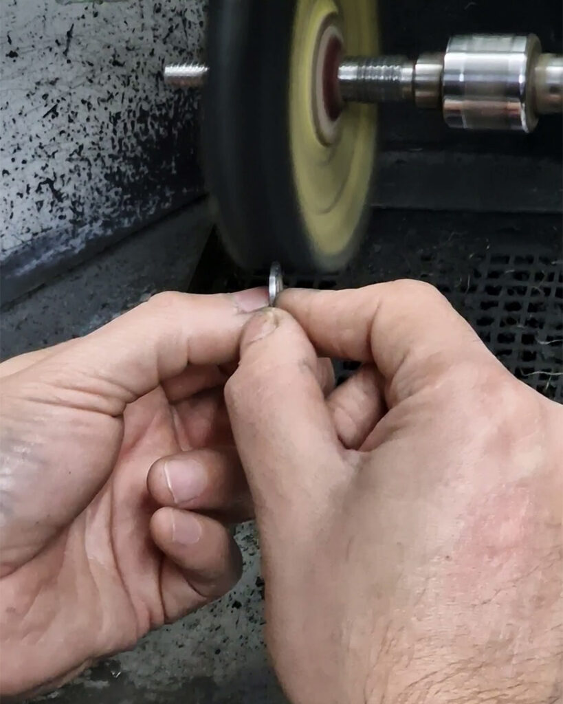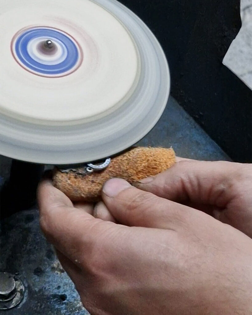 Jedes Schmuckstück wird geduldig von Hand poliert by hand — removing micro-scratches and bringing out the metal’s natural shine.